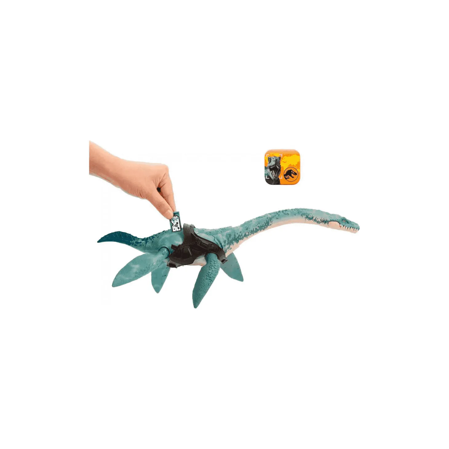 - Juego en realidad aumentada: Escanea el código oculto en el dinosaurio usando la aplicación gratuita Jurassic World Facts para desbloquear experiencias de realidad aumentada y juegos temáticos.
