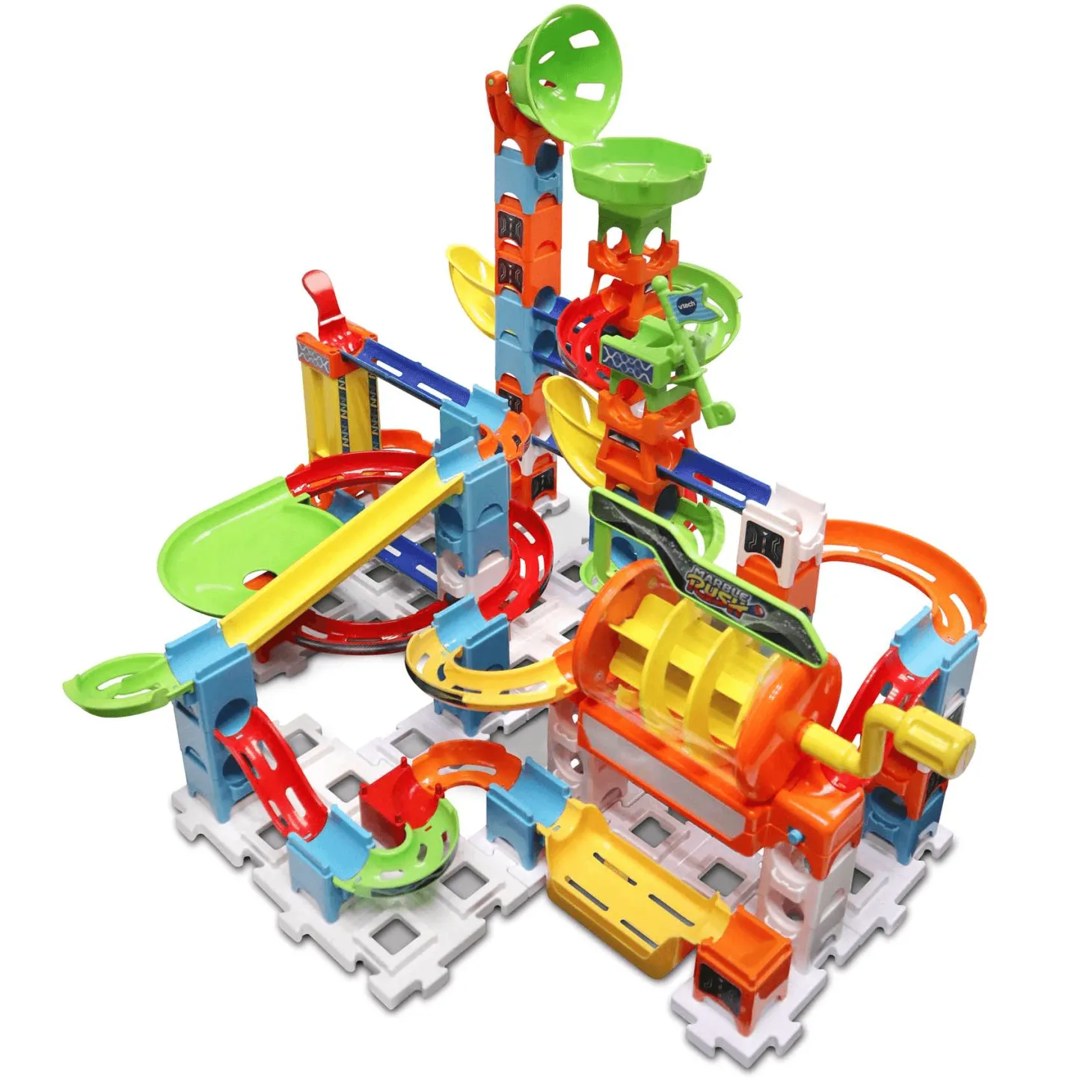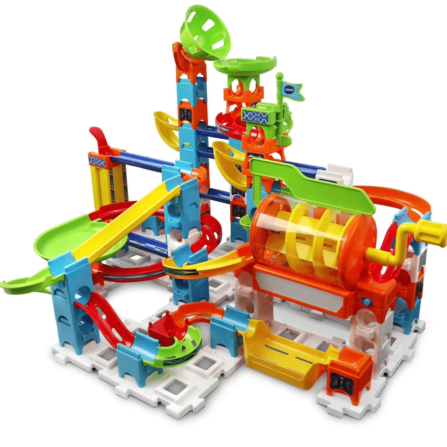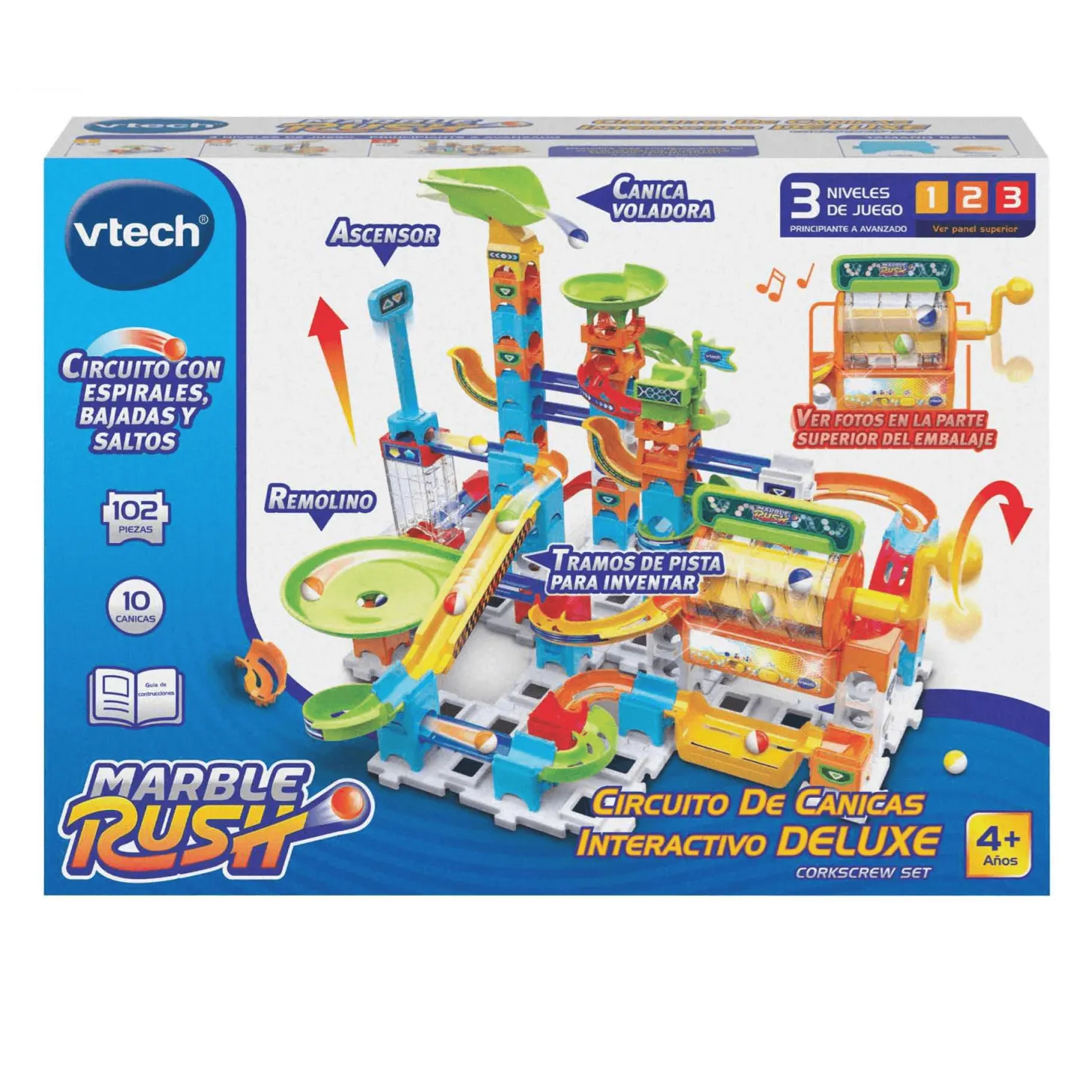 - Ascensor, canica voladora, remolino, tramos de pista para inventar y… ¡pieza electrónica con efectos, luces y sonidos!