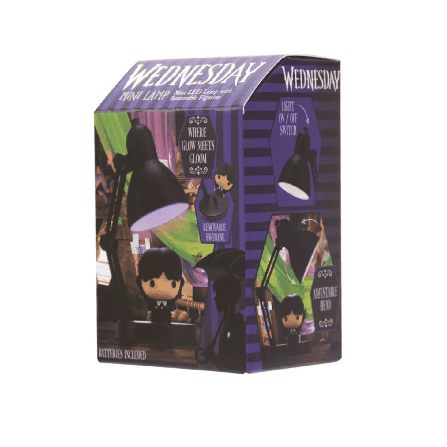 Meta descripción: Ilumina tu escritorio con la mini lámpara de Wednesday, de solo 9 cm y que funciona con pilas LR41. Ideal para fans de la serie que buscan un toque oscuro y funcional.