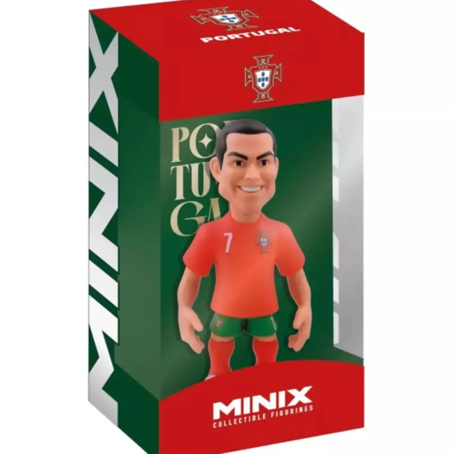La figura Minix Cristiano Ronaldo 12 cm representa al jugador en uniforme de Portugal, con licencia oficial. Con sus detalles cuidados y tamaño ideal, es perfecta para destacar en vitrina o para regalar a quienes aman el fútbol.