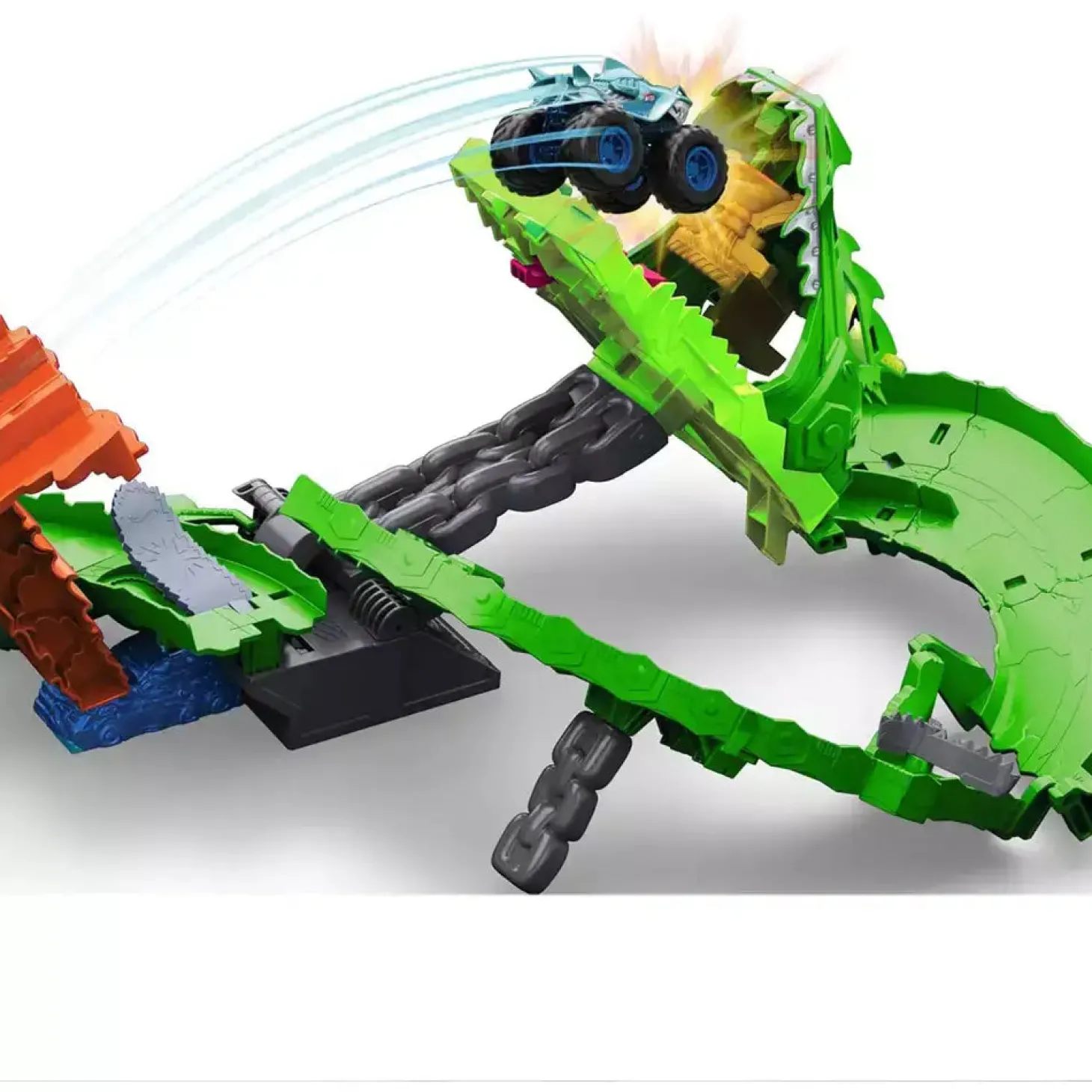 - Qué incluye: Conjunto de pista y 2 Monster Trucks 1:64 (Great Bite y Rageasaur).
