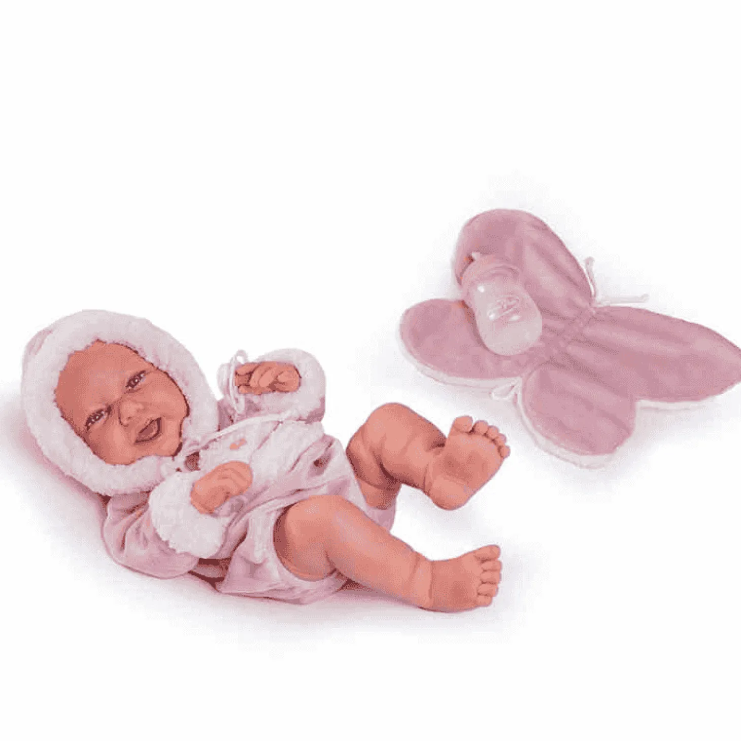 - Accesorios Incluidos: La muñeca viene acompañada de una toallita para el hombro, ideal para secarle después de tomar el biberón, además de un biberón y un chupete con cadena.