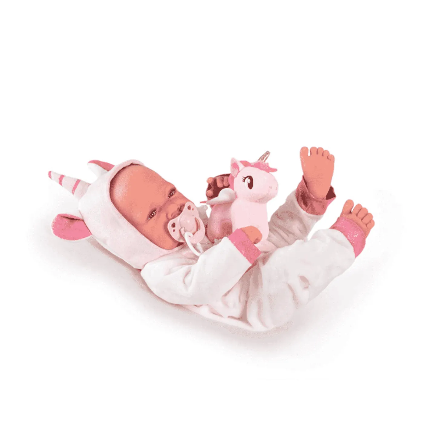 A esta Muñeca Recién Nacida le encanta jugar a disfrazarse, y hoy ha elegido su traje más especial: un adorable disfraz de unicornio con un tejido brillante que lo hace mágico. Su capucha tiene orejitas y un cuerno de unicornio como los de verdad, creando un look único y encantador.