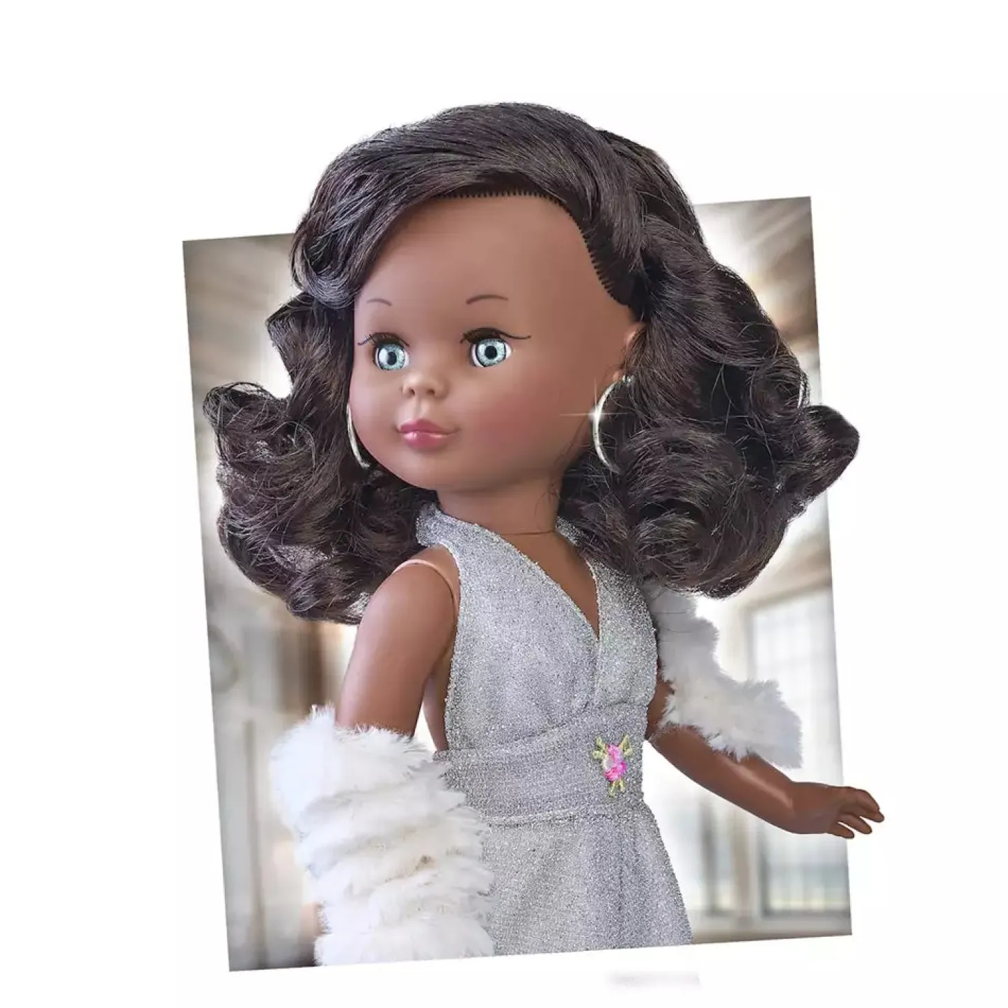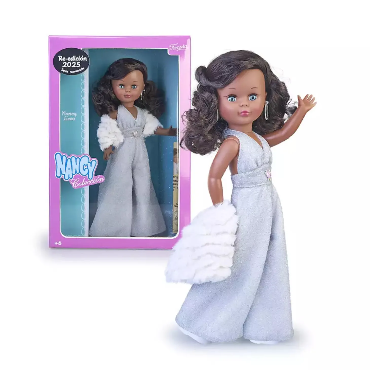 La Nancy Colección Liceo Edición 2025 regresa con el brillo y glamour de los años 70. Su mono plateado largo, chal efecto visón y peinado ondulado evocan la elegancia de la época.