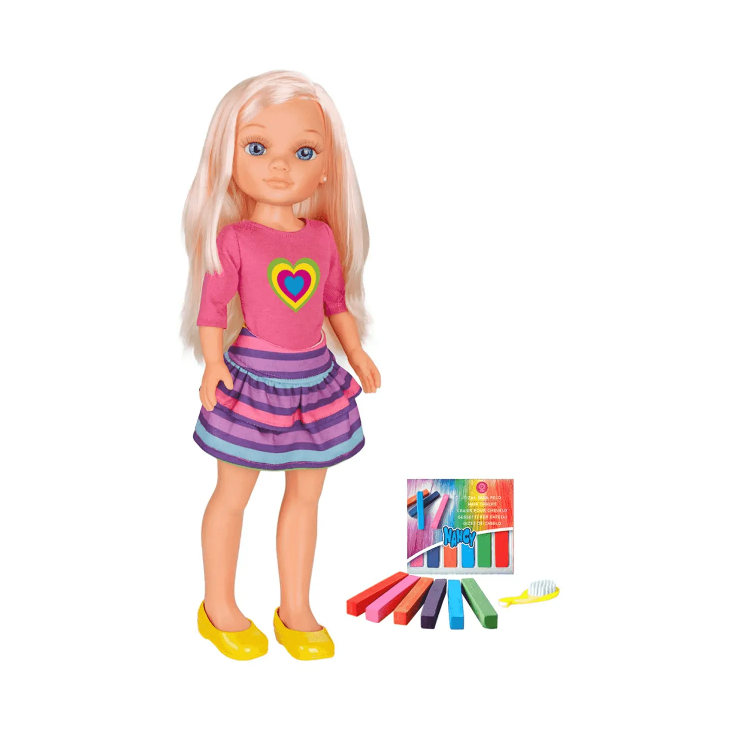 Nancy mide aproximadamente 43 cm. Incluye tizas de colores, un peine y gomas para el pelo. Es una muñeca de melena larga y ojos claros. Su hermoso atuendo está compuesto por una blusa rosada, decorada con un corazón de colores. Tiene una falda a rayas con tonalidades moradas, azules y rosadas, y unos bellos zapatos amarillos.