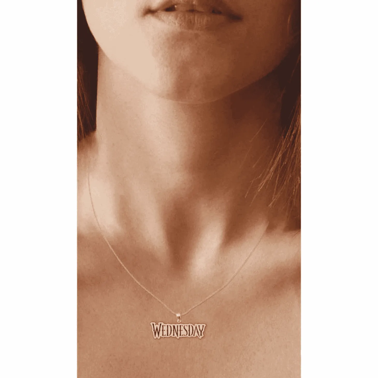 - Diseño: El colgante presenta el logotipo de ´Wednesday´ grabado con detalles finos y un estilo sombrío, ideal para cualquier seguidor de la serie. Su forma sencilla pero poderosa refleja la esencia del personaje.