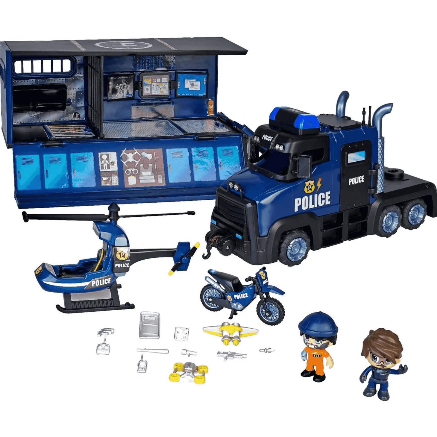 - Incluye : 2 figuras. Poli y preso (con 1 cara de impostor) . Chaleco propulsor y muchos Accesorios.
