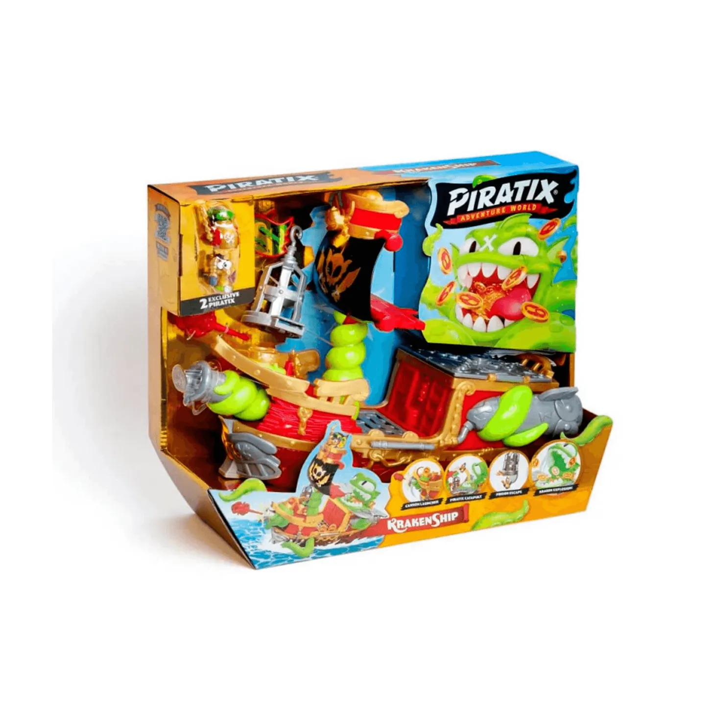 - Set Completo de Accesorios: Incluye 2 figuras Piratix exclusivas, un proyectil para el cañón, una catapulta, una prisión para capturar a los enemigos, y diversos tesoros dorados.