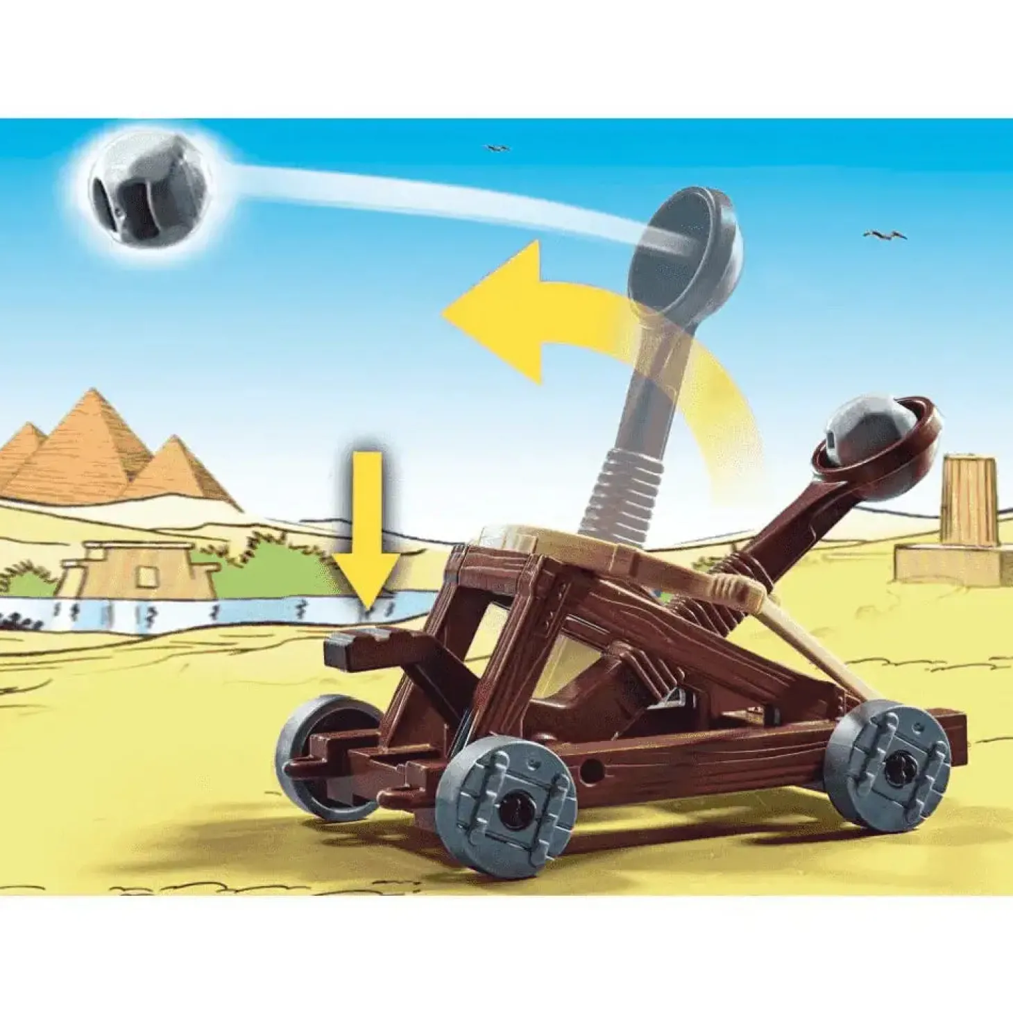 ¿Qué incluye? En su famosa aventura ‘Astérix y Cleopatra’ del año 1965, Astérix, Obélix y Panorámix viajan al lejano Egipto. Allí quieren ayudar a Numerobis el mejor arquitecto de Alejandría a construir un nuevo palacio para César en sólo tres meses. Gracias a la ayuda de los irreductibles galos y a una pequeña poción mágica, la empresa casi desesperada tiene éxito, el palacio se termina a tiempo y Cleopatra gana su apuesta contra César. Con el flamante Astérix: Numerobis y la Batalla del Palacio, los fans podrán acompañar a Astérix y Obélix en su viaje para visitar a Cleopatra en Egipto. El juguete de 56 piezas de Astérix incluye 5 figuras PLAYMOBIL, Obélix, Numerobis, Ideafix y 3 romanos, una catapulta, columnas, piedras y otros extras para reproducir la Batalla por el Palacio.