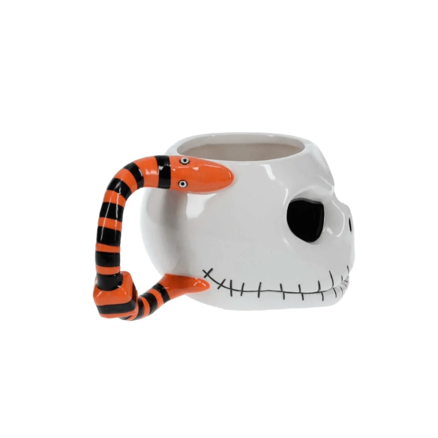 Esta espectacular taza está hecha de cerámica de alta calidad y representa la cabeza de Jack Skellington. Su asa, con forma de serpiente, está diseñada siguiendo la estética única de esta genial película animada. Con una capacidad de 300 ml, es perfecta para un buen desayuno y, además, puedes usarla sin problemas en el lavavajillas y el microondas.