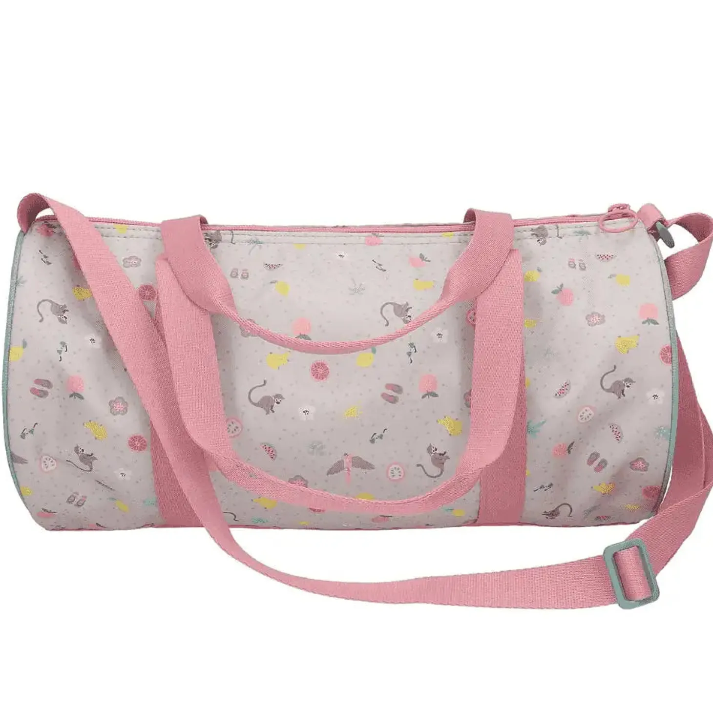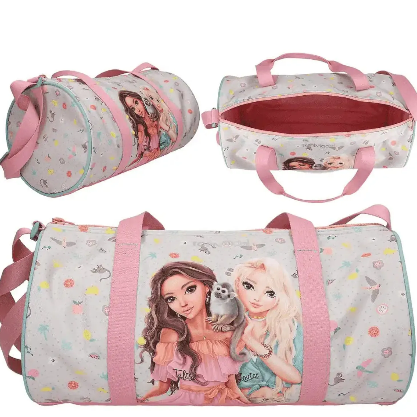 Descripción del producto: Estilosa, fresca y afrutada. La bolsa de deporte Juicy de TOPModel es de color gris claro y está estampada con palmeras, soles, frutas, flores y monitos en colores alegres. Además, lleva una modelo a gran tamaño en el centro. Las asas son fucsia, con detalles color melocotón. En el espacioso interior tiene un bolsillo extra con cremallera. Material: poliéster 100 por 100.
