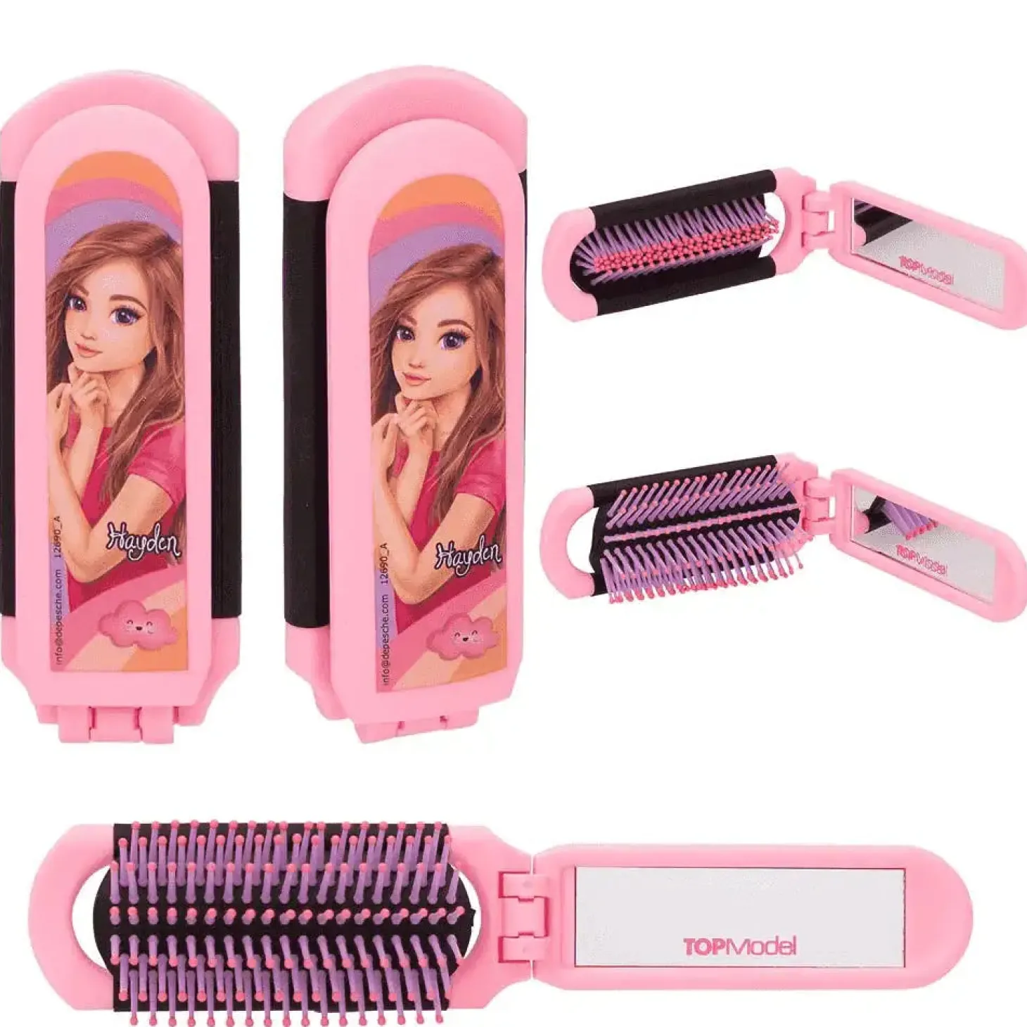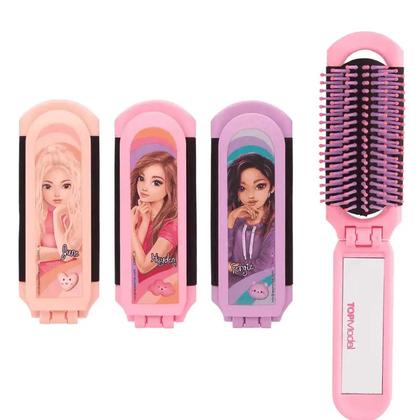 Descripción del producto: Los cepillos alargados plegables de TOPModel tienen mucho estilo y son muy prácticos. Plegados caben en cualquier bolso, llevan un espejo interior y, por supuesto, están adornados con imágenes de modelos muy guapas. En tres colores: rosal, lila y albaricoque.
