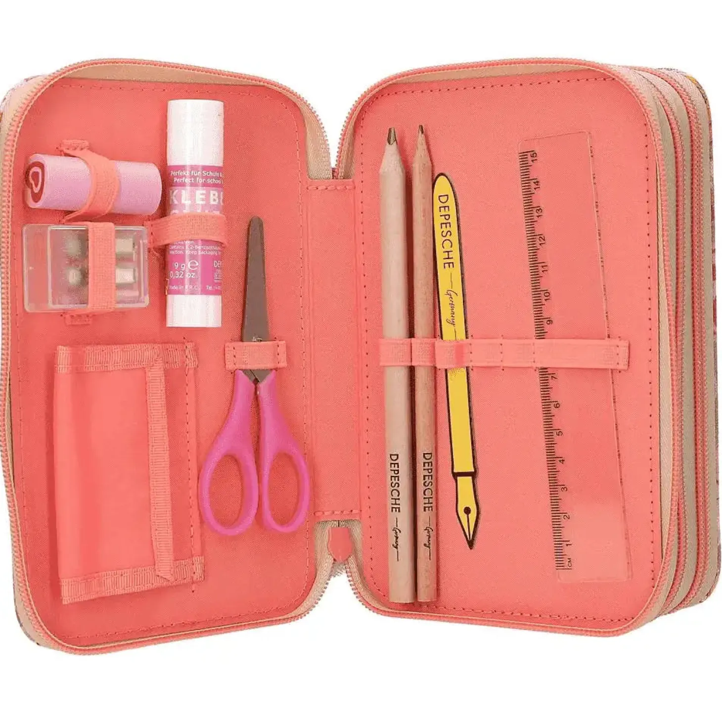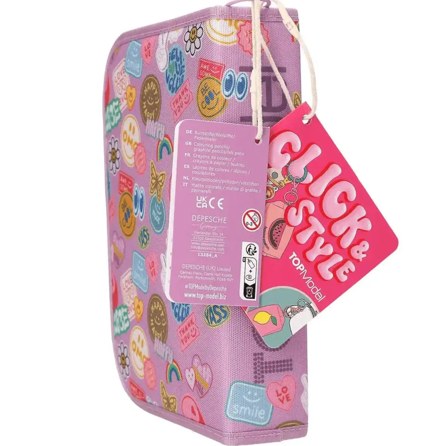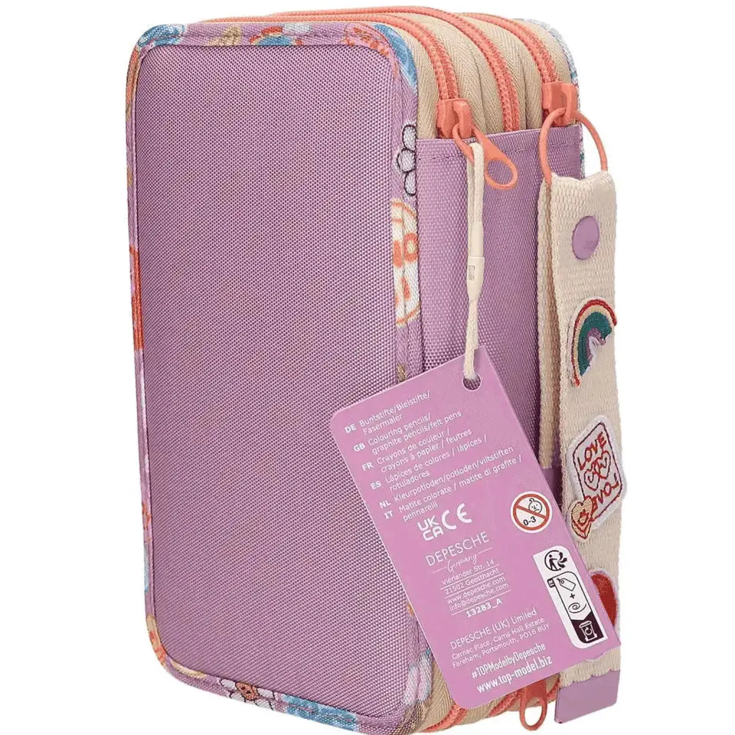 Descripción del producto: Este estuche lila lleva una modelo a gran tamaño en la cara principal. Un detalle que destaca son los bordes cosidos con estampado colorido tipo batch. Los tres compartimentos separados vienen completamente llenos con 18 lápices de colores, 18 rotuladores, 2 lápices, sacapuntas, goma de borrar, regla, tijeras e incluso va provisto de un bolsillito interior con cierre de velcro. Material principal: poliéster 100 por 100.