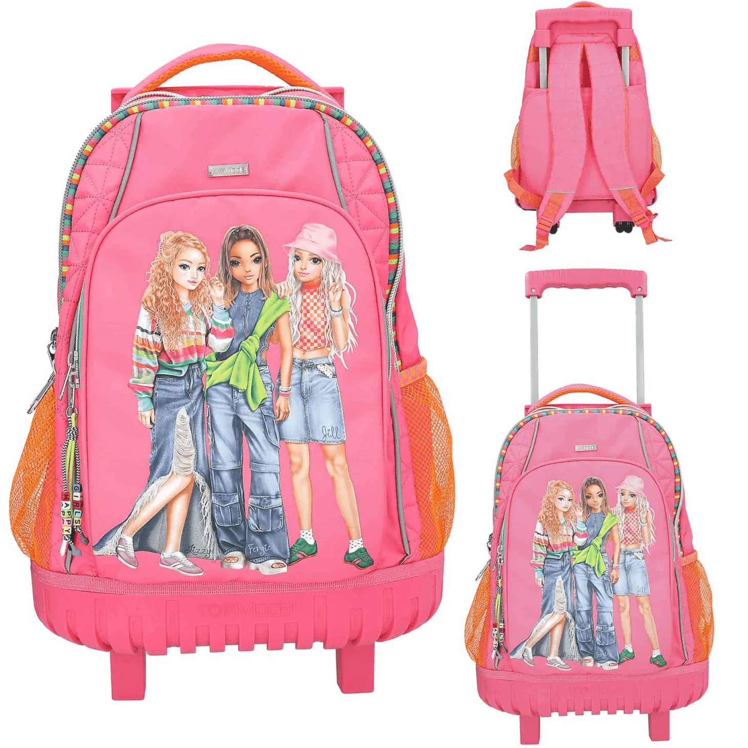 Lo colorido da alegría. La mochila escolar fucsia de la colección JOY de TOPModel con ruedas integradas lleva un motivo precioso con tres modelos en el bolsillo grande de la cara delantera, cremalleras con distintos estampados multicolor, bolsillos laterales de red color naranja y un chulísimo tirador de la cremallera hecho a base de cintas y cuentas de letras que componen el texto HAPPY GIRLS. Detalles muy prácticos a destacar: ruedas de marcha suave, mango telescópico (86 cm), 3 compartimentos muy espaciosos, asas acolchadas, tirantes acolchados ajustables, base con tratamiento antimanchas y antihumedad, guardabarros para que las ruedas no manchen la ropa al llevar la mochila a