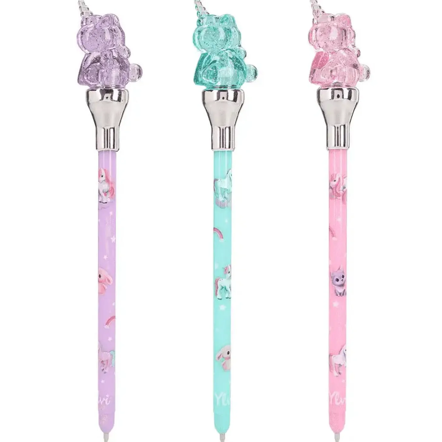 Descripción del producto: ¡Se enciende al escribir! El unicornio semitransparente y brillante que remata el bolígrafo de Ylvi se ilumina al apretar la mina para escribir. El cuerpo del bolígrafo está decorado con monísimos unicornios y animalitos mágicos. Ni las pilas ni la mina (azul) son recambiables. Disponibles 3 diseños diferentes (rosa, turquesa, lila).